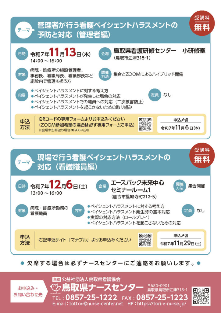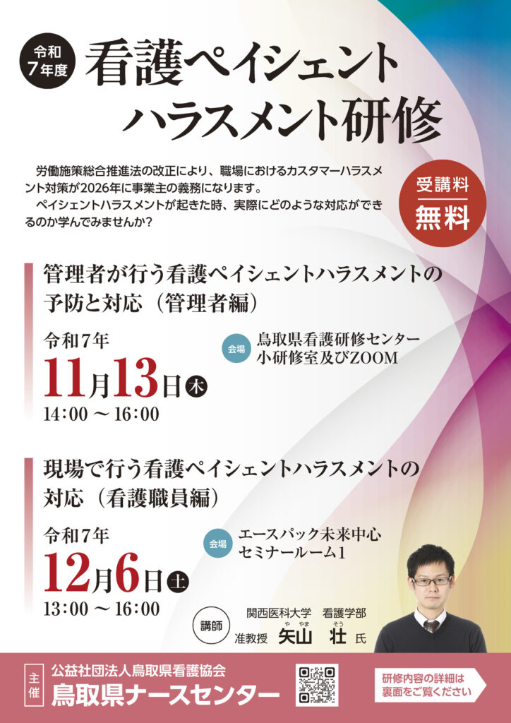 11/13・12/6開催「看護ペイシェントハラスメント研修(管理者編・看護職員編)」についてのご案内